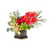 Bu saksı, içindeki kırmızı antoryum, kırmızı gül, orkide kandili ve yeşil krizantem ile renkli ve zengin bir atmosfer yaratır. Her bir bitki, kendi özel özellikleriyle bu saksıyı özel kılar. Her detay özenle seçilmiş, doğanın güzellikleriyle iç mekanınızı buluşturan bir kombinasyon sunar. Bu saksı, zarifliği ve canlı renkleriyle yaşam alanınızı renklendirir.